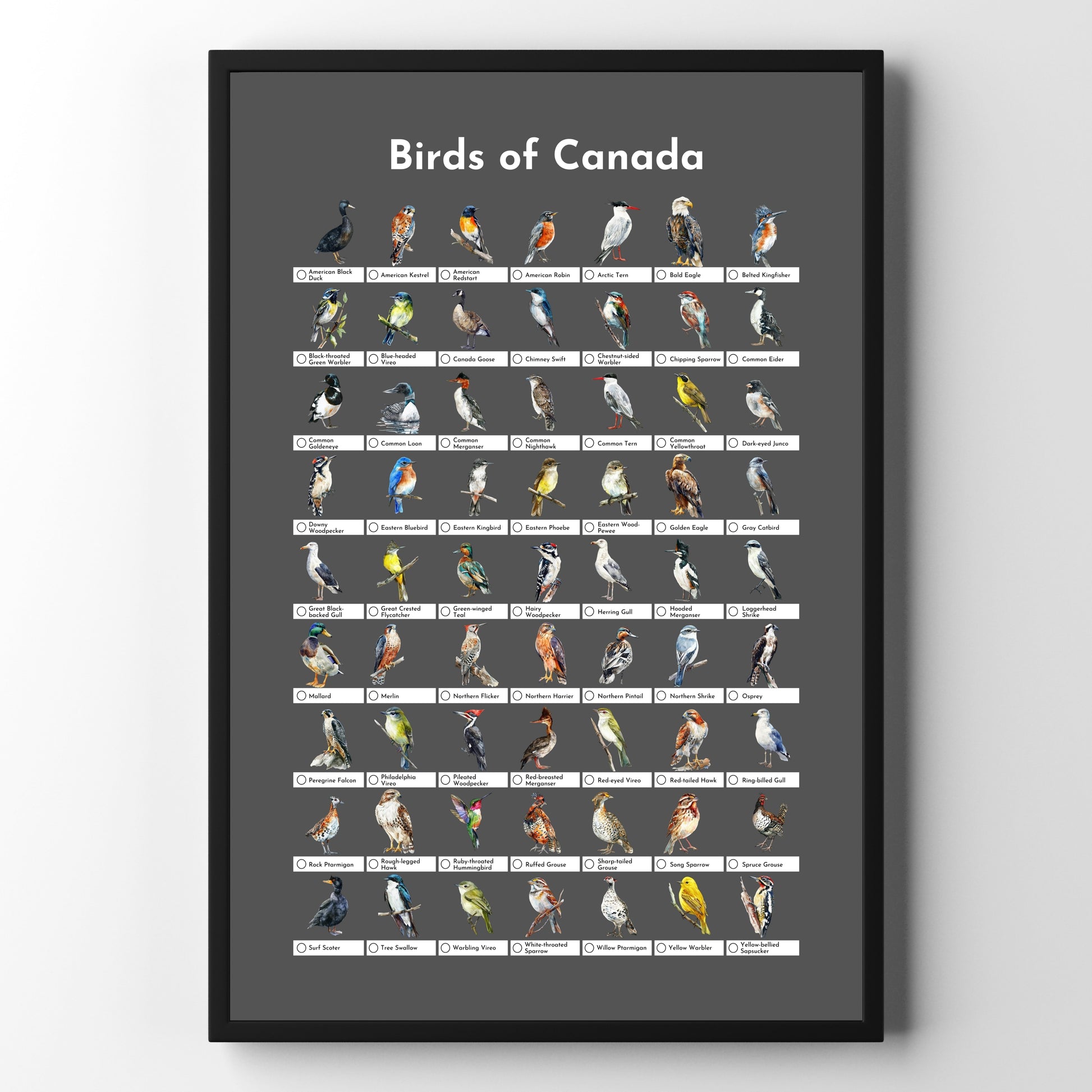 Celebrate the diversity of Canadian birdlife with this beautifully designed charcoal grey checklist poster, featuring the most common bird species found across Canada.